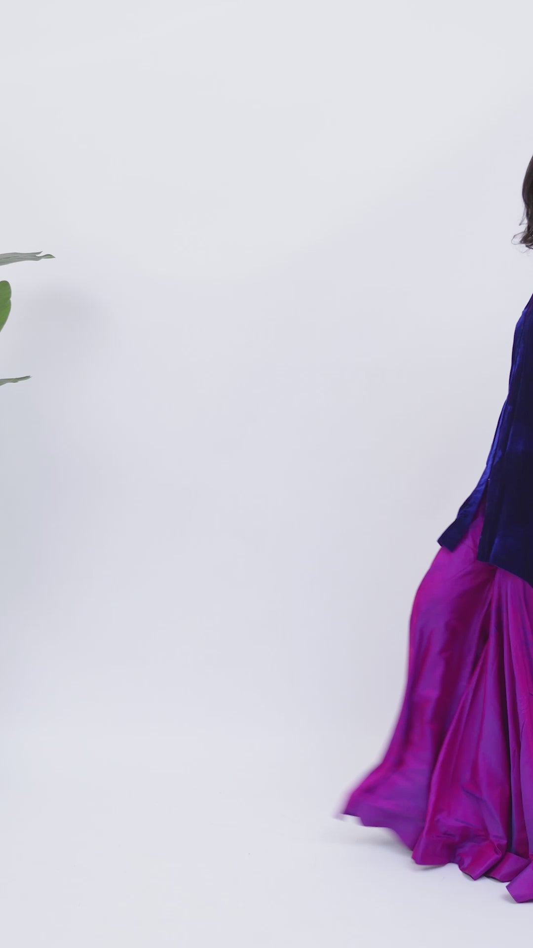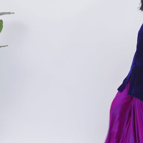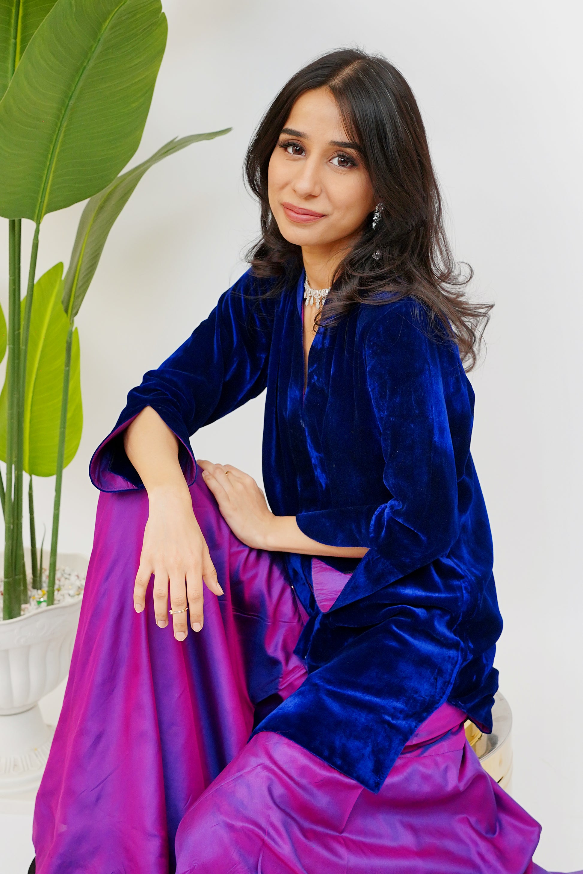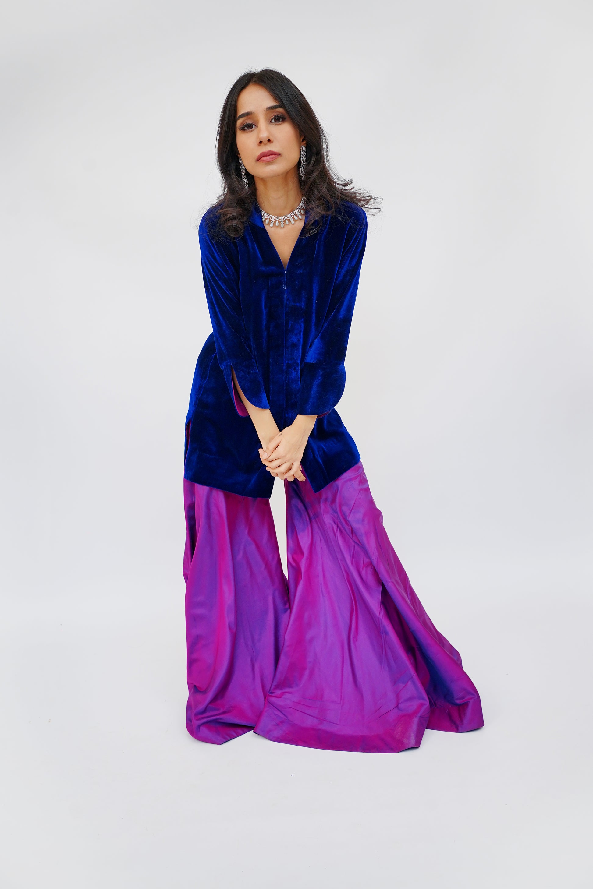 This ensemble exudes rich elegance, the pure velvet shirt is paired with a two-toned gharara that adds dimension and movement. The interplay of textures and hues creates a regal, contemporary silhouette perfect for festive occasions or sophisticated gatherings.