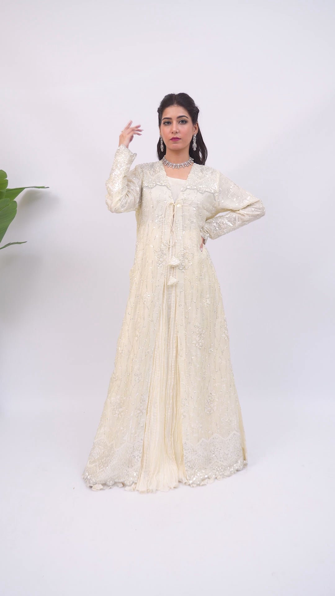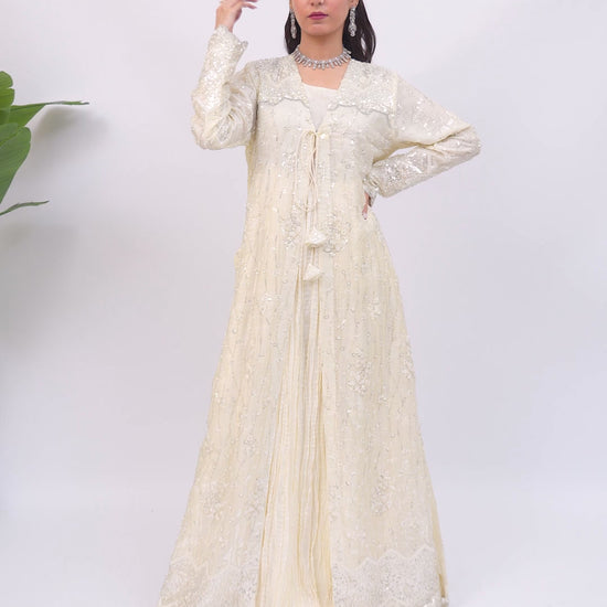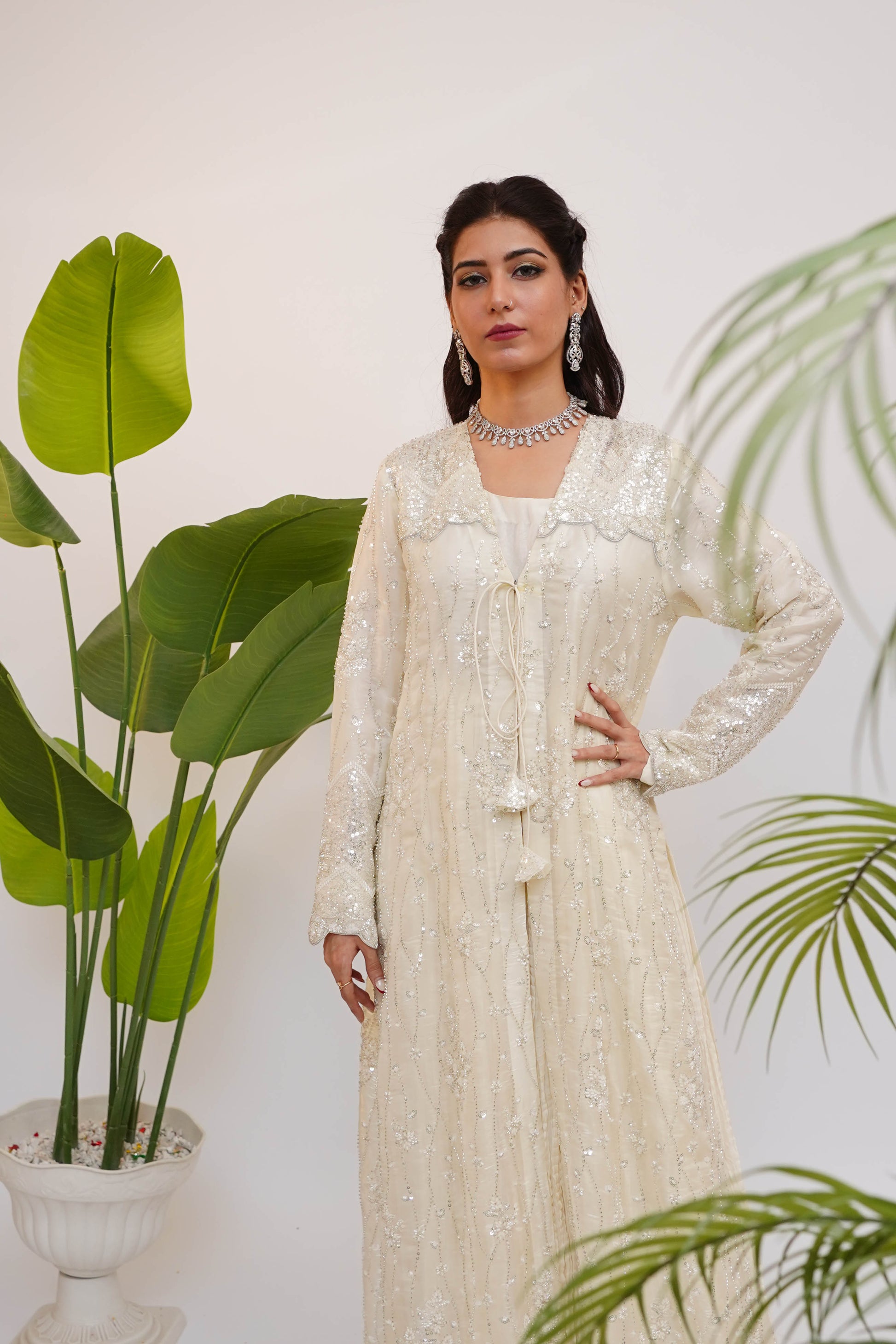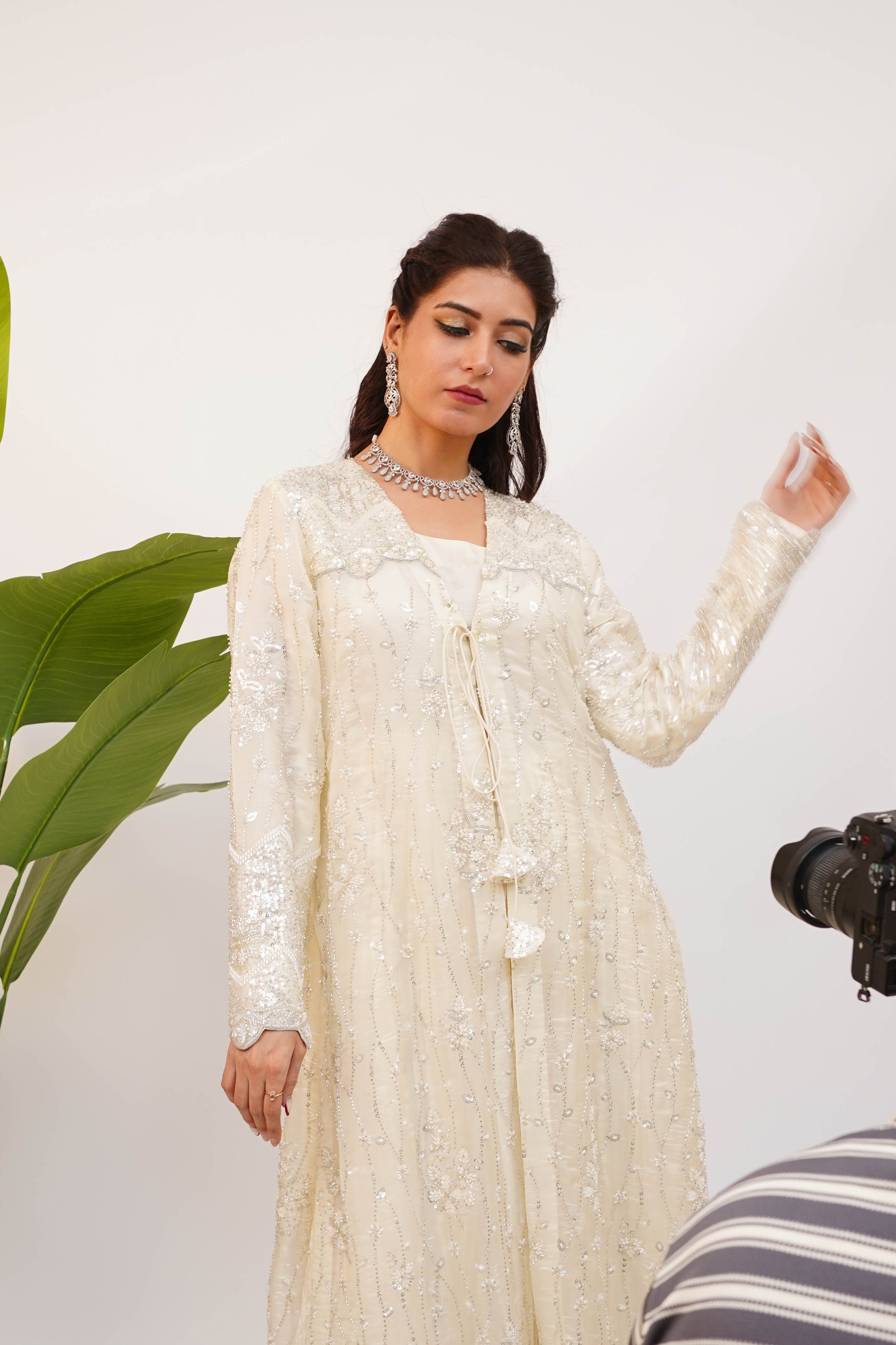 Ethereal and effortlessly elegant, this white crush pishwaas ensemble combines fluid textures with refined craftsmanship. The soft drape and delicate finish create a graceful silhouette, perfect for festive occasions,the crush fabric add dimension and depth. Perfect for formal gatherings, or moments that call for understated sophistication.